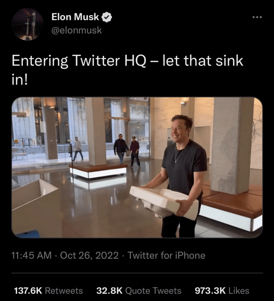 The day before the deal was sealed, Elonicus swaggered into Twitter headquarters carrying an actual kitchen sink, tweeting “let that sink in!” to his 100 million followers, the first of a series of such stunts to follow.