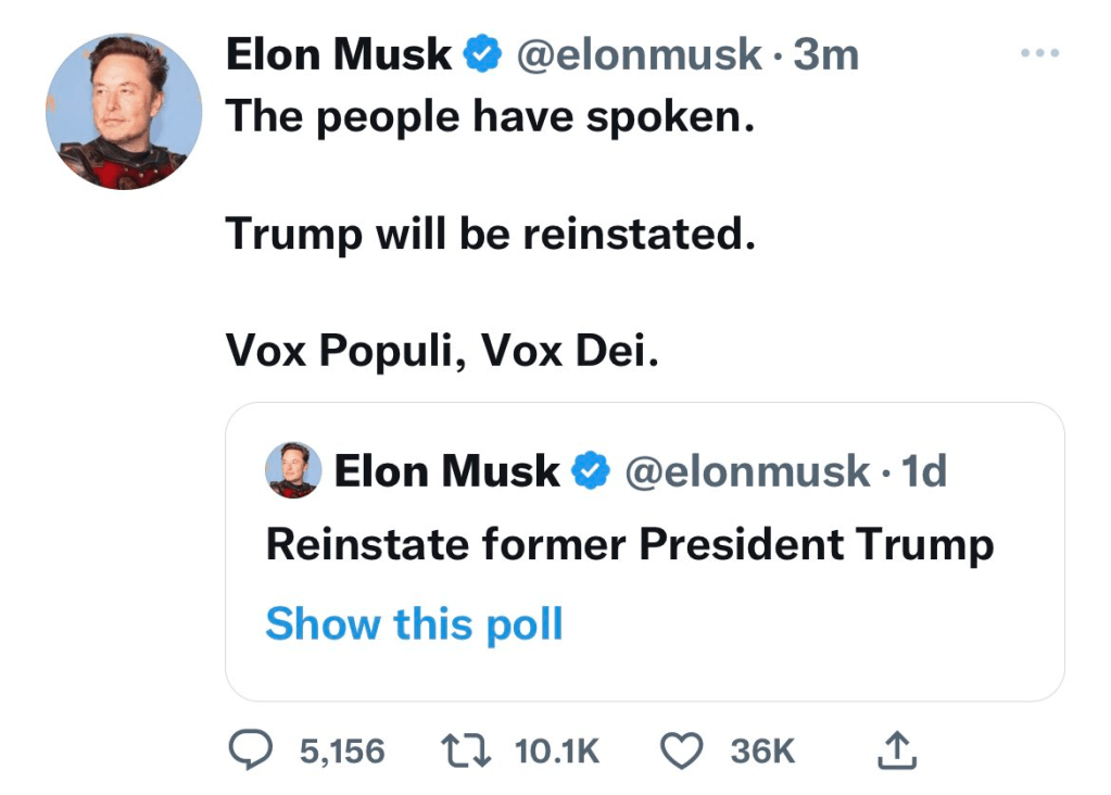 And now, apparently, Elonicus, in his mercy, after running another Vox Populi poll stunt, has decreed a “general amnesty” for all political prisoners (i.e., suspended Twitter accounts). It remains to be seen whether this “amnesty” extends to the countless people whose accounts were suspended for challenging the official Covid narrative, or for mentioning the fact that GloboCap is arming and funding the neo-Nazis in the Ukraine that have been carrying out its latest counterinsurgency op, but let’s not worry about minor details. Next week is going to be a celebration … a celebration of freedom, and “anti-Wokeness,” and the god-like power of Elon Musk!