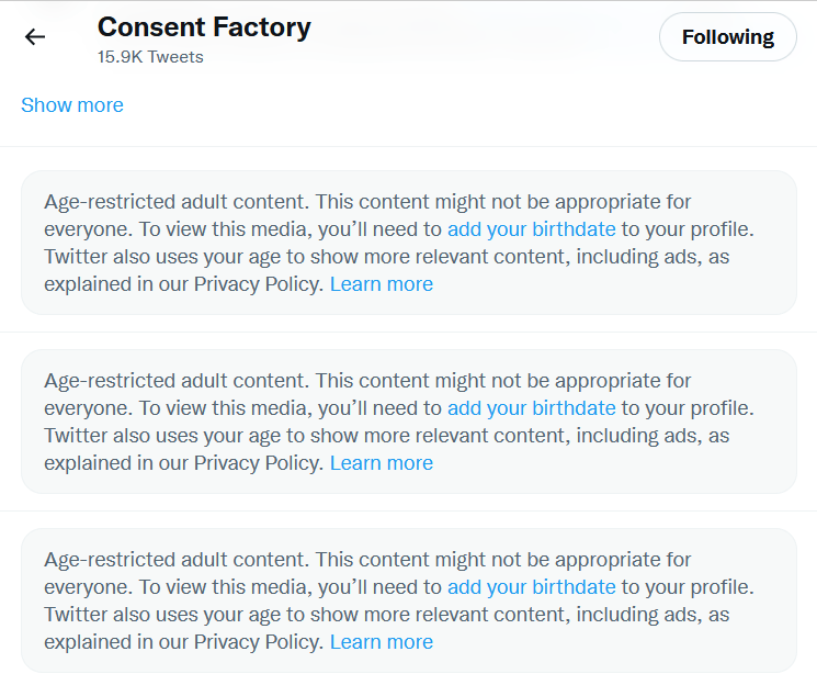 The other thing is … well, it’s personal. For about a year now, Twitter has been maliciously defaming my business account in order to damage my reputation and income. Twitter has been doing that by concealing my tweets — the majority, but not all, of my tweets — behind fake “age-restricted adult content” advisories. Twitter has been doing that in order to trick people into believing that I am tweeting some kind of pornography.