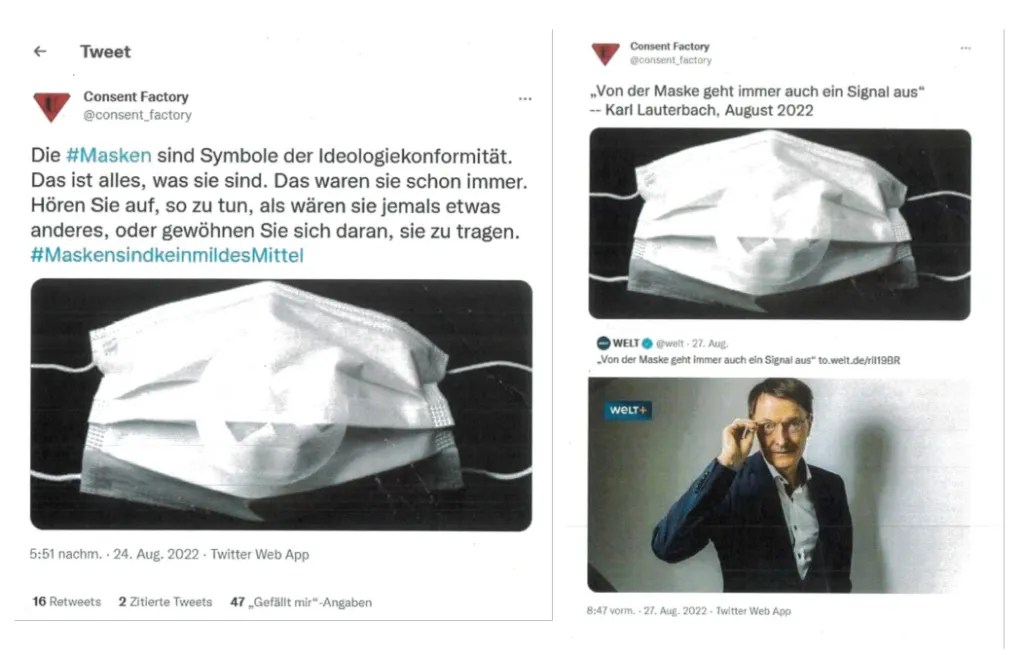 The one on the left reads, “The masks are ideological-conformity symbols. That is all they are. That is all they have ever been. Stop acting like they have ever been anything else, or get used to wearing them.” The one on the right is a quote by Karl Lauterbach, the Minister of Health of Germany. It reads “The masks always send out a signal.” The image is the cover art of my book.