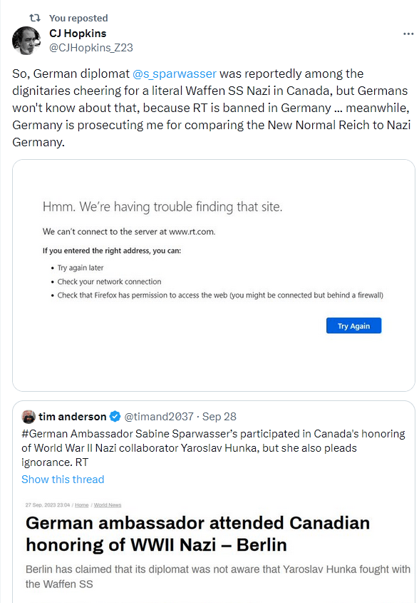 Oh, yeah, and speaking of the Germans, as it turns out, the German ambassador to Canada was among the crowd of dignitaries enthusiastically honoring a Nazi. Of course, the German public won’t be aware of that, as the German media will not report it, and RT, which did, is banned in Germany.