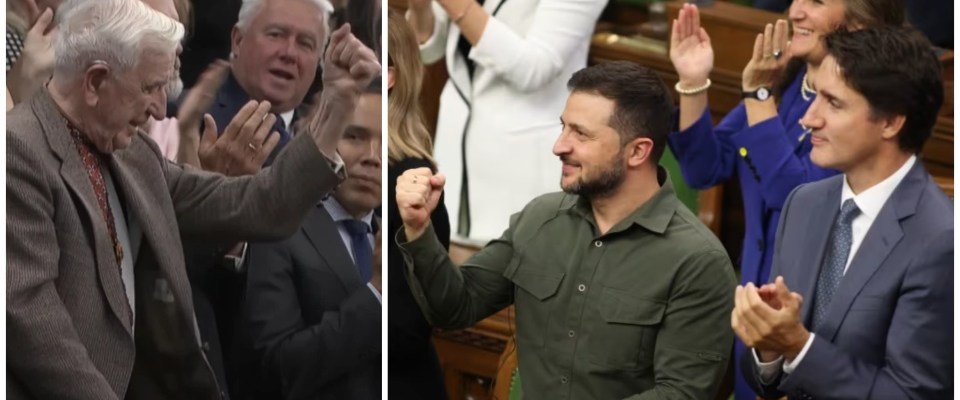 Justin Trudeau, Prime Minister of Canada, Volodymyr Zelensky, President of Ukraine, and the members of the Canadian parliament and other dignitaries in the House of Commons thanked Yaroslav “for all his service.” They rose to their feet, beaming up at Yaroslav with gratitude and adoration, and clapped like a bunch of trained Nazi seals.