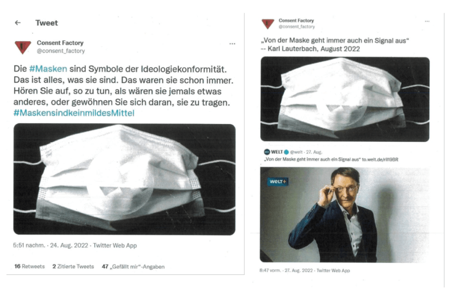 I am an author and a political satirist and commentator. In August 2022, I posted two Tweets criticizing mask mandates and making fun of Karl Lauterbach, Germany’s Minister of Health. Both Tweets included an image from the cover artwork of my latest book, The Rise of The New Normal Reich: Consent Factory Essays, Vol. III (2020-2021).