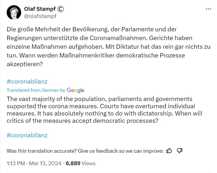No, this is definitely not the German authorities staging a public “accountability” spectacle in order to memory-hole what happened during 2020-2023 and enshrine the official narrative in history. There’s going to be a formal “Inquiry Commission” — conducted by the same German authorities that managed the “crisis” — which will get to the bottom of all the regrettable but completely understandable “mistakes” that were made in the heat of the heroic battle against The Divisive Virus!