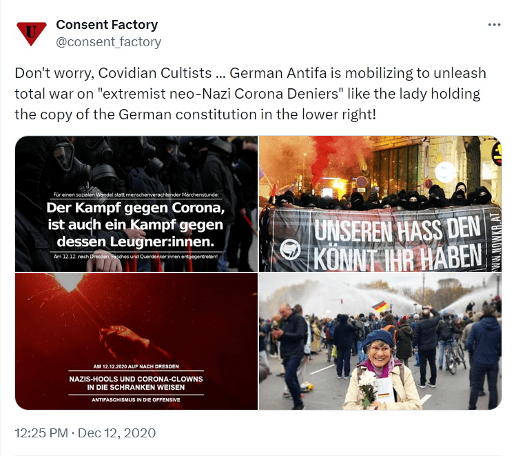 And, while the Commission is inquiring into the possibly slightly inappropriate behavior of their law enforcement officials, they might want to also take a look at the behavior of their unofficial goon squads, like Antifa, which they accidentally encouraged to attack the “anti-vaxxers,” the “Covid deniers,” and anyone brandishing a copy of the German constitution.