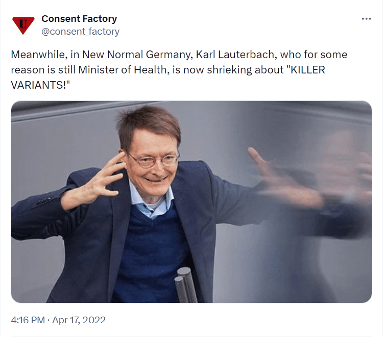 And then there’s the whole “vaccination” business. The Commission will certainly want to inquire into that. They will probably want to start their inquiry with Karl Lauterbach, and determine exactly how he accidentally lied to the public, over and over, and over again …