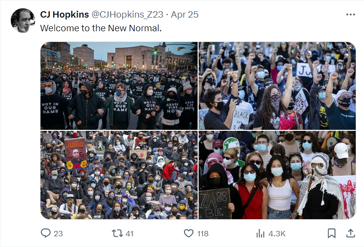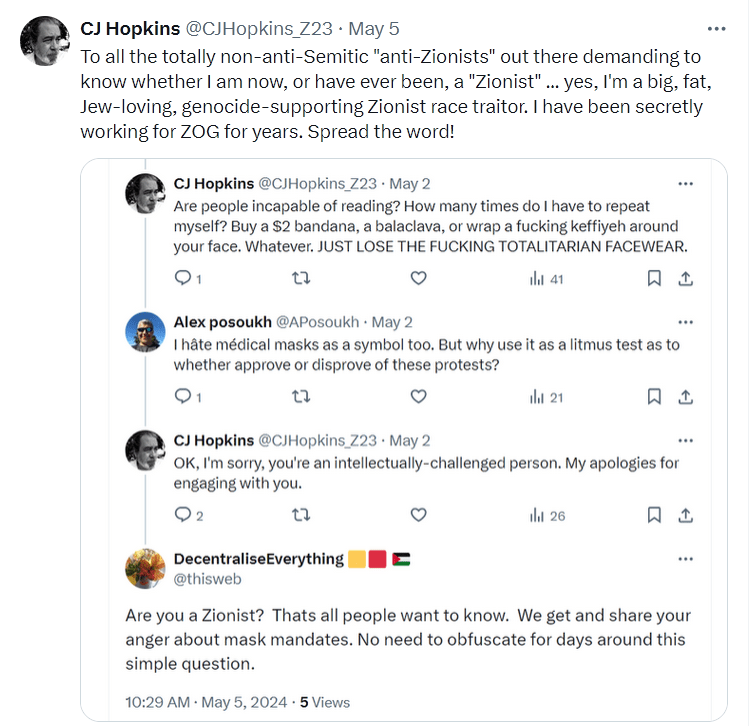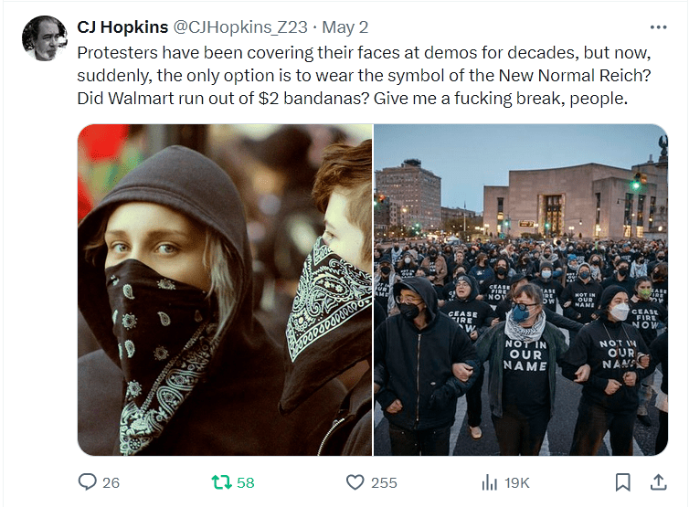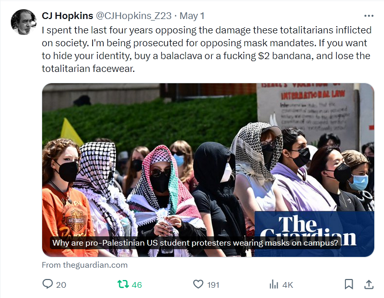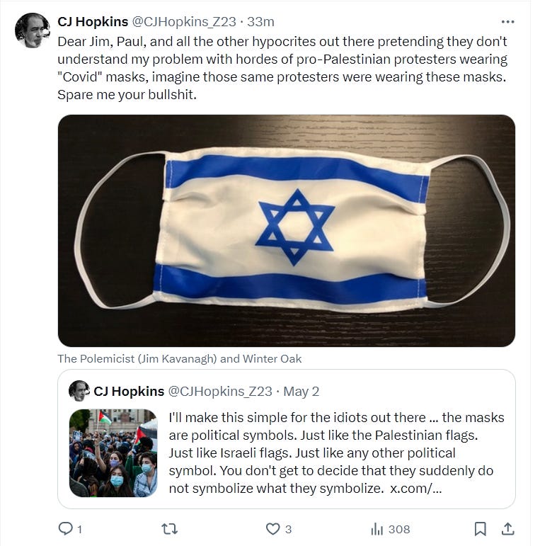 Addendum: Having been subjected to the desperate rationalizations of assorted apoplectic hypocrites pretending they don’t understand my “problem” with pro-Palestinian protesters wearing “Covid” masks, en masse, at demos, for three days, I have attempted to clear that up for them on Twitter (see below). I sincerely hope this will bring an end to their hypocritical bullshit, and their nasty little character-assassination campaign. (May 12, 2024)