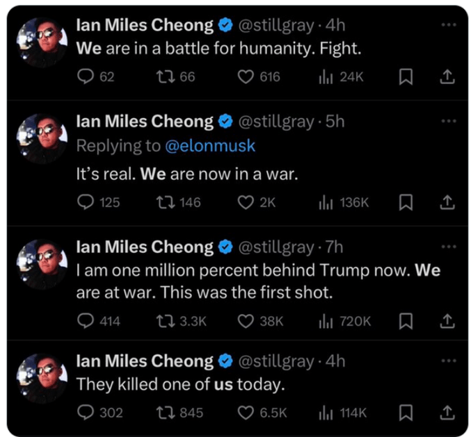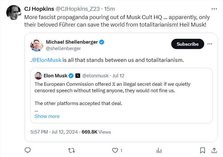 Again, I realize emotions are high, what with the attempted assassination of Donald Trump, and the ongoing liquidation of Gaza, and the ongoing left/right culture wars, and the rise of the Cult of Elon Musk, and the aftermath of the “Apocalyptic Plague of 2020-2022,” and the “January 6th Insurrection,” and so on … but maybe try, just for a few minutes, to step back from all the false dichotomies and all the thought-terminating clichés and the hatred and fear that we are being systematically inundated with, and reflect on where all this excitement is leading us, and how our passions are being instrumentalized … and by whom and for what purpose they are being instrumentalized.