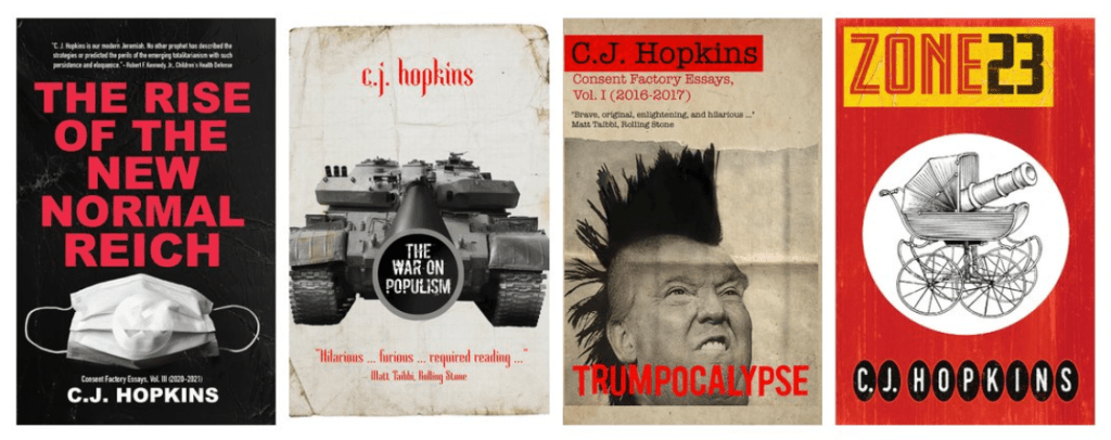 Please note that our 2017 paperback edition of Zone 23 is out-of-print. So you’ll have to buy the new hardcover edition published Arcade Publishing, the literary imprint of Skyhorse Publishing, which (i.e., Skyhorse) also published C. J. Hopkins’ fourth collection of Consent Factory Essays. So, all right, we were wrong about that “no respectable publisher” remark.
